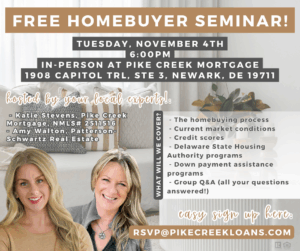 Join Katie Stevens, Realtor with Pike Creek Mortgage (NMLS# 2511516), and Amy Walton, of Patterson-Schwartz Real Estate for an informative session on everything you need to know about buying a home.